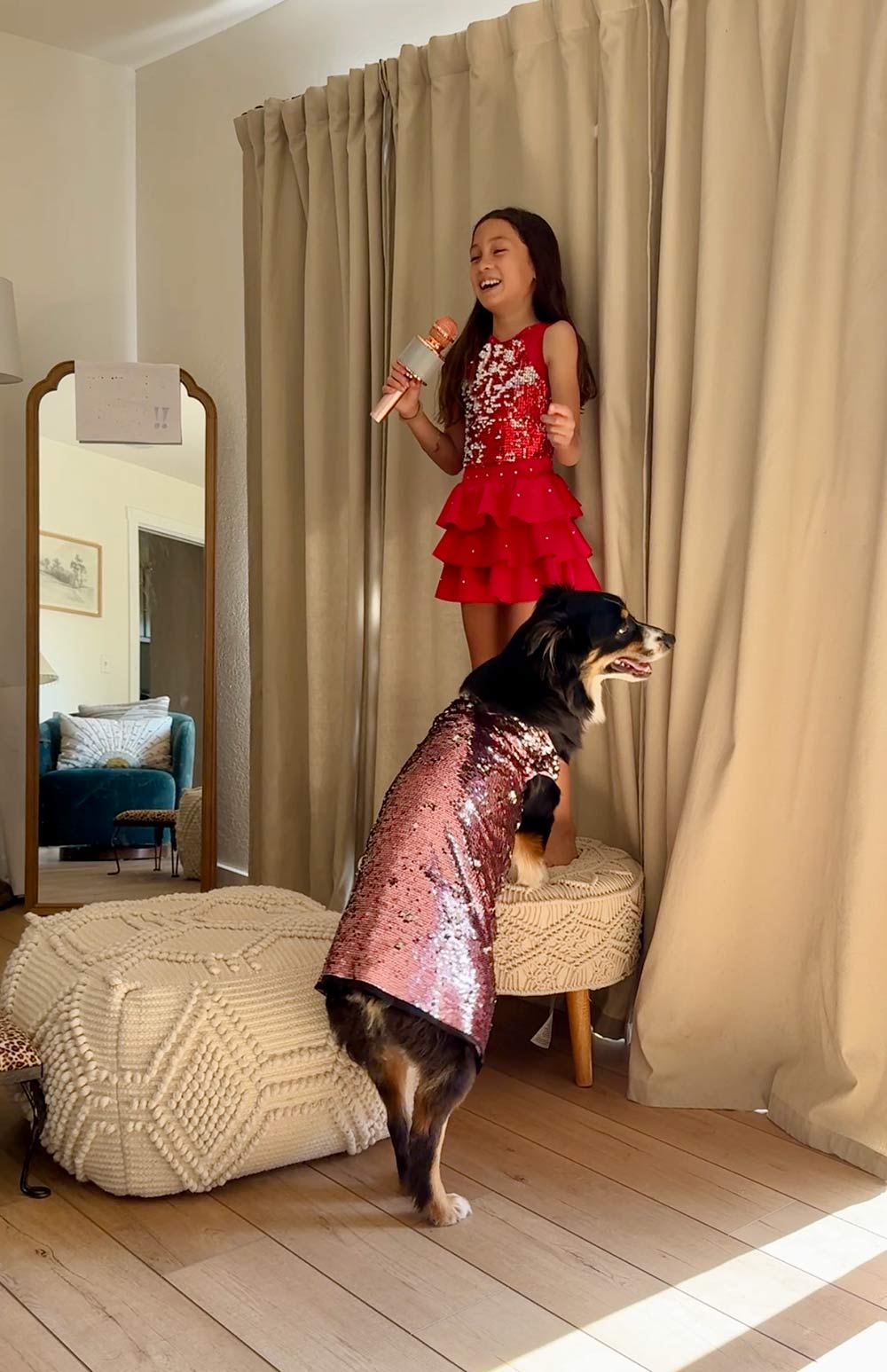 Glad you’re doing well! Also, I love the pic of Connor and the dog in the dress! Hehe too cute! And I love the ottoman and cube!
