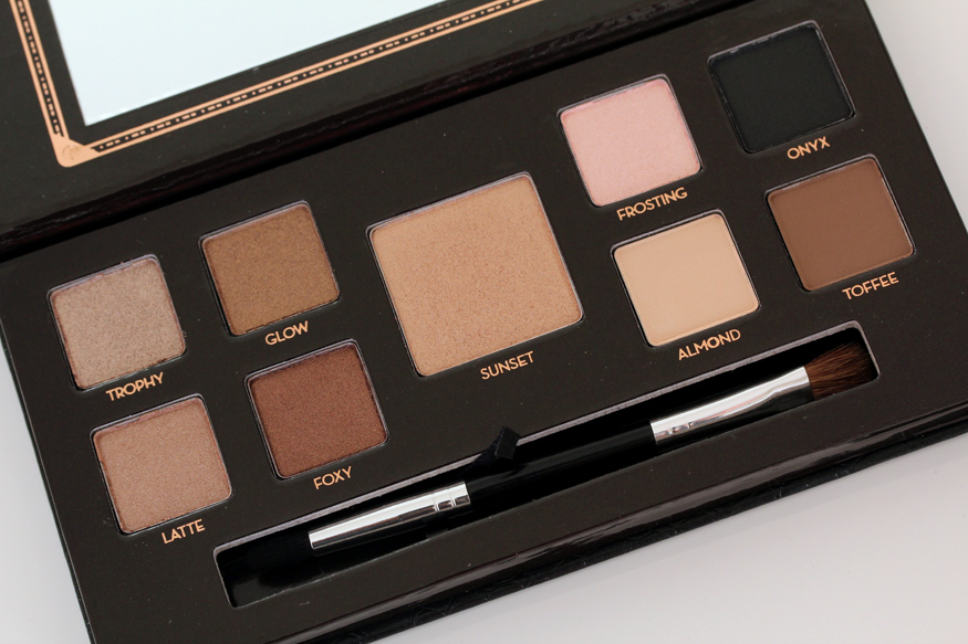 - An eyeshadow palette with nine powder shades in mostly shimmery brown, beige, taupe and purple colors; the palette pops out of the larger velvet box for easy touch-ups on the road