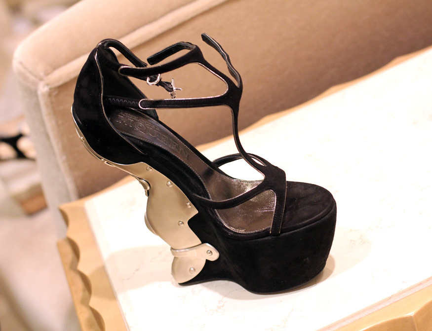 I’m pretty sure I wouldn’t be able to even stand in these Alexander McQueen shoes (available now at Neiman Marcus). I still like ’em, though. 🙂