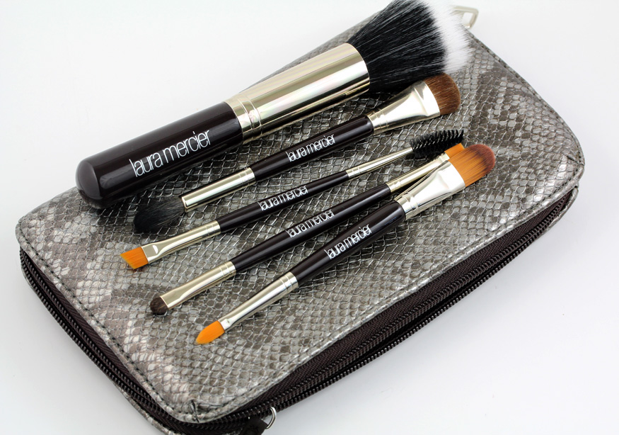 The kit, one of several of Laura’s holiday 2011 offerings, includes four travel size dual-ended eye brushes, a full size skunk brush and a faux snakeskin pouch with a removable insert.