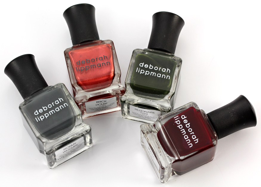 New colors from Deborah Lippmann! From the left: Stormy Weather, Brick House, Billionaire and Single Ladies, $16 each.