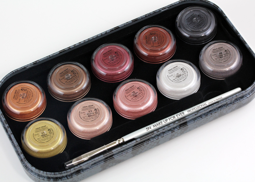 If you’re unfamiliar with the Aqua Creams, they’re long-wearing waterproof cream shadows that are deliciously easy to blend. Some of them can be worn on cheeks and lips, others on cheeks and eyes; all 10 of the ones in this set are of the cheeks and eyes variety.