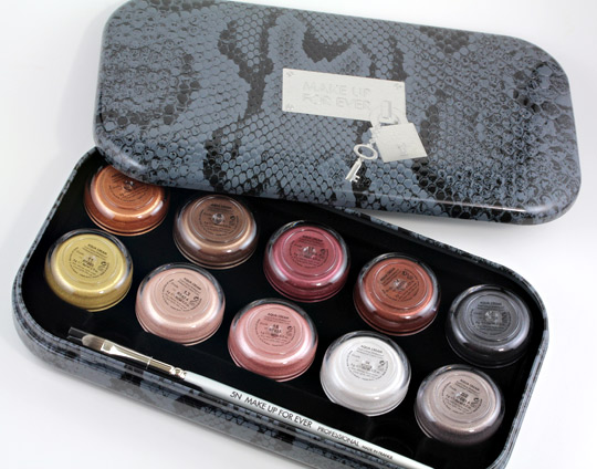 The snakeskin pattern on the outside — I mean that’s kinda wild — and the silver accent on the top? That’s pretty chic. And then there’s the colors inside. Six Make Up For Ever Eye Shadows in Bronze, Khaki, Pearly Light Pink, Brown Black, Metallic Copper and Beige, and a small Aqua Eyes #0L liner in black. From more conservative beige and brown (chic) on one side, to bolder green and bronze on the other (wild!).