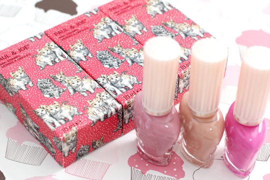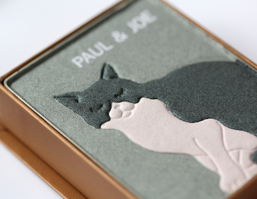 If you look closely at the pans in the new Paul & Joe Face & Eye Colors (from the limited edition Collection Sparkles), you’ll notice that the kitties all have their eyes shut. Tabs makes the same face when he’s purring, aww!