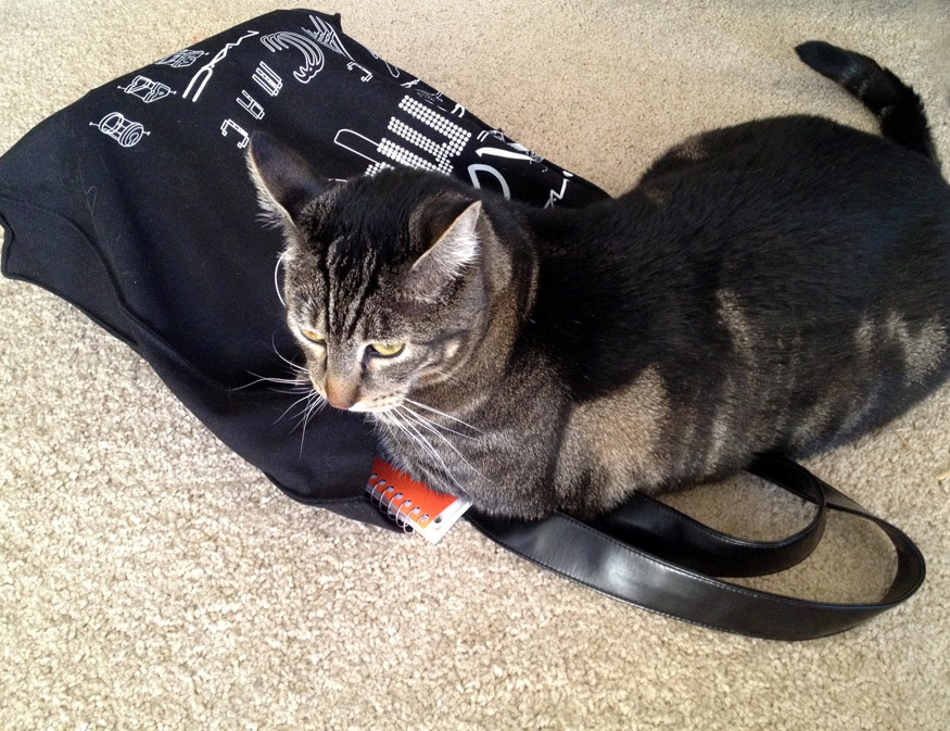 Tabs quite enjoys laying on top of my tote bags and placing his paws inside.