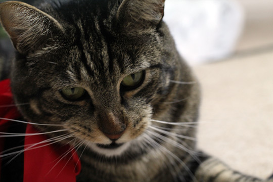 Unsurprisingly, the only ones that haven’t been working are the ones pertaining to Tabs. This morning I made him a can of Fancy Feast tuna in gravy for brunch because I was too lazy to do it last night (he did still have plenty of dry food in his bowl though), and to protest what I’m sure he perceives as substandard living conditions, he bit my ankle in the kitchen.