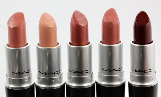 Lipsticks from the left: Barely Lit, Brew, Mellow Flame, Sparks Can Fly and Burnin’